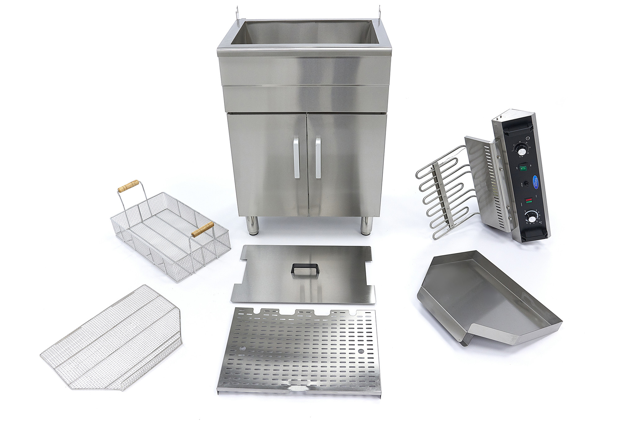 A szekrénnyel ellátott talapzatra szerelt mélysütő 400 V-os feszültséggel működik. Ezenkívül a készülék túlterhelés elleni védelemmel van ellátva az extra biztonság érdekében. A hidegzónának köszönhetően a sütőolajat is tovább használhatja. A fűtőelem kissé a fritőz alja fölé van függesztve. A fűtőelem és az alja közötti összes olaj kissé hűvösebb marad. Így az áteső morzsák nem égnek meg olyan gyorsan, és az olaj hosszabb ideig jobb minőségű marad. Az elektromos fritőz hőmérséklete 50°C és 200°C között állítható, és kényelmes időzítővel rendelkezik.
