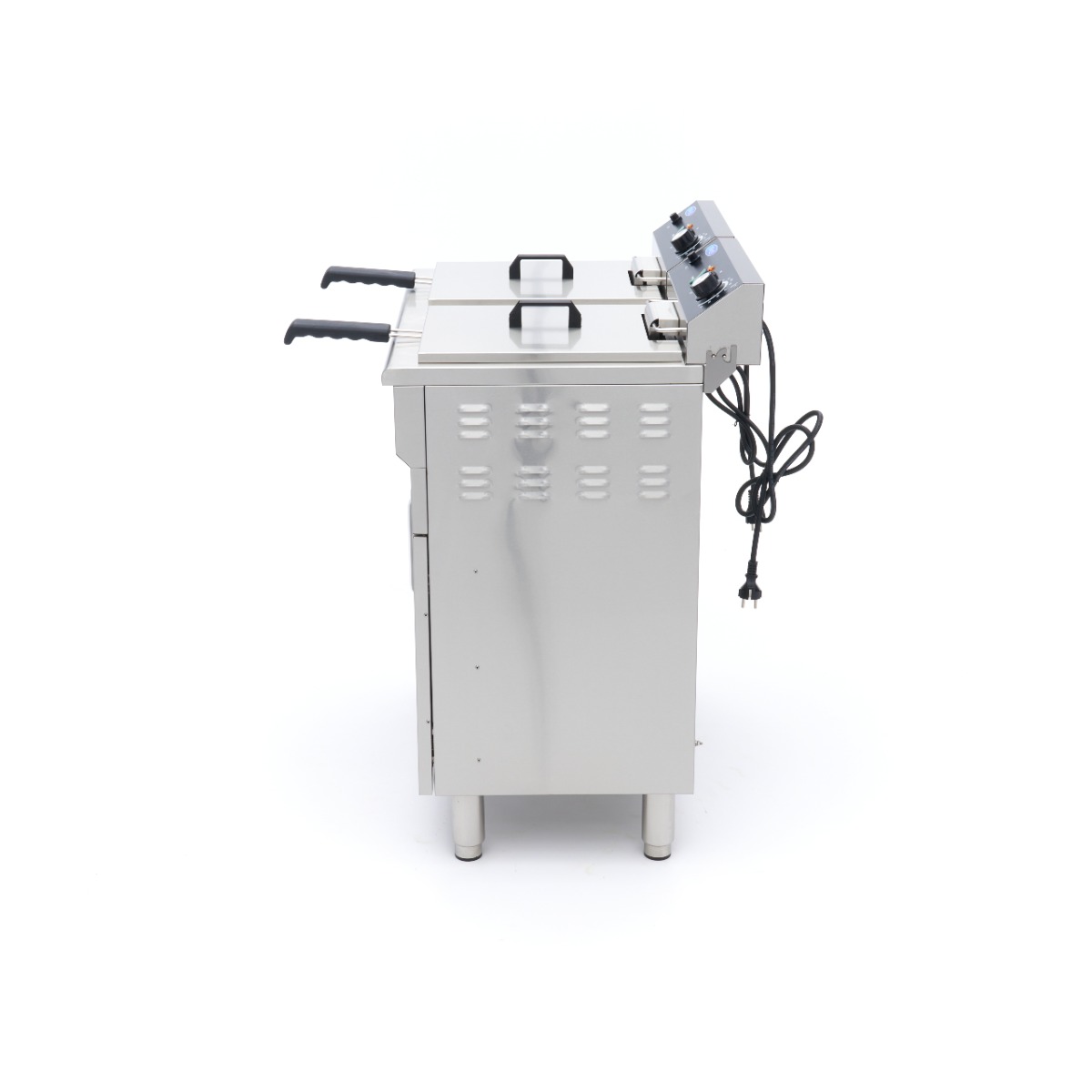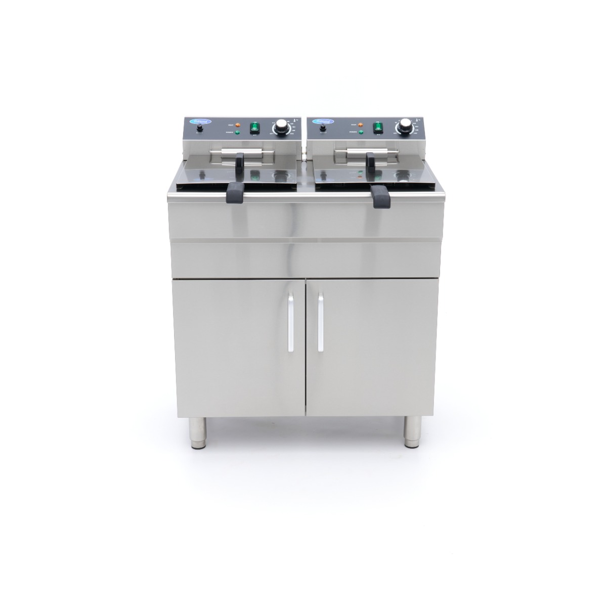 Sok nagyméretű fritőzzel ellentétben ez a modell nem igényel külön áramellátást. Mindegyik egységnek saját dugasza van, ami biztosítja az energiahatékonyságot, mivel csak akkor használ áramot, amikor a fritőz be van kapcsolva. A dupla fritőz tágas, két ajtóval ellátott tárolószekrénnyel rendelkezik, amely tökéletes a készletek, például a sültolaj kényelmes tárolására. A fritőz kialakítása kényelmes munkamagasságot biztosít a könnyű sütéshez. Mindegyik fritőz az olajtartály alatt lefolyócsappal is rendelkezik, ami megkönnyíti az olaj eltávolítását. A csapba épített szűrő biztosítja, hogy a morzsákat felfogja, így az olaj hosszabb ideig marad tisztább. Ezenkívül mindkét fritőz rendelkezik hideg zónával, amely megakadályozza az ételmaradékok elégését, és meghosszabbítja a sütőolajok élettartamát. Az alapfelszereltséghez tartoznak a rozsdamentes acél sütőkosarak, a fedelek túlmelegedés elleni védelme és a fűtőelem alatt elhelyezett biztonsági kapcsoló.