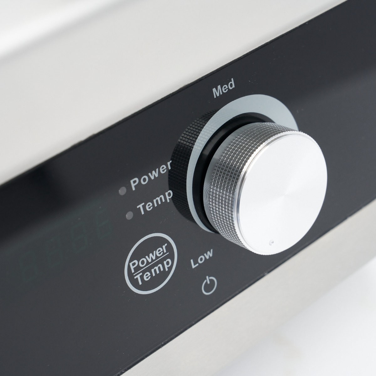 Ennek az indukciós woklapnak a kezelőpanelje a maximálisan egyszerű használatot szolgálja. A "Power/Temp gomb" egyetlen megnyomásával kiválaszthatja, hogy a teljesítményt (1-10. fokozat) vagy a hőmérsékletet (60-240°C) kívánja-e beállítani. A hőmérséklet 20°C-os lépésekben állítható. A teljesítmény és a hőmérséklet összekapcsolódik: az 1. szint 60°C, a 2. szint 80°C stb. A kijelzőn jól látható, hogy éppen melyik beállítást állítja be. A forgatógomb segítségével gyorsan kiválaszthatja a megfelelő fokozatot: "alacsony", "közepes" vagy "magas". A be/kikapcsoló gomb biztosítja, hogy a woklap kikapcsoláskor azonnal leálljon.