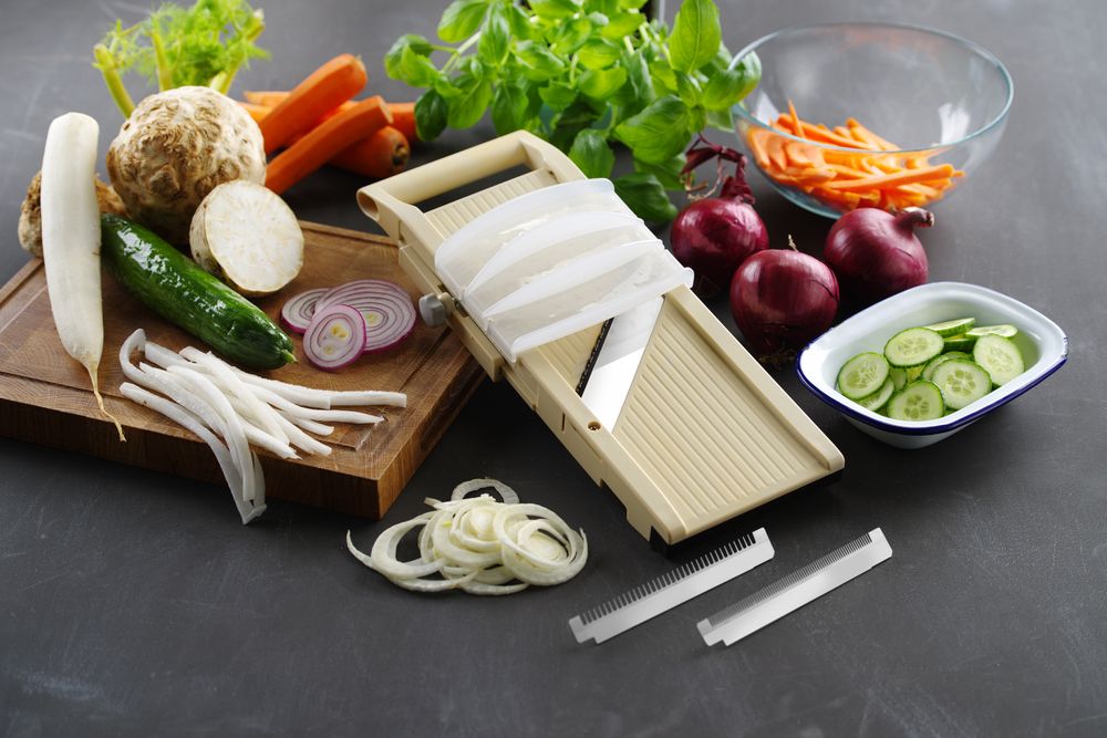 Mellékelve: 3 cserélhető fogazott penge a julienne vágásához: 1 mm, 2 mm, 8 mm vastag.