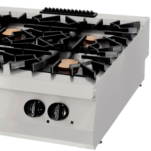 A főzőlap kerek sarkokkal készült a könnyű tisztíthatóság érdekében. Ezenkívül az égők gyújtólánggal vannak felszerelve, és van egy termoelemmel ellátott gázbiztonsági szelep is. Piezo gyújtás is van, és a főzőlap alkalmas LPG vagy földgázzal való használatra.